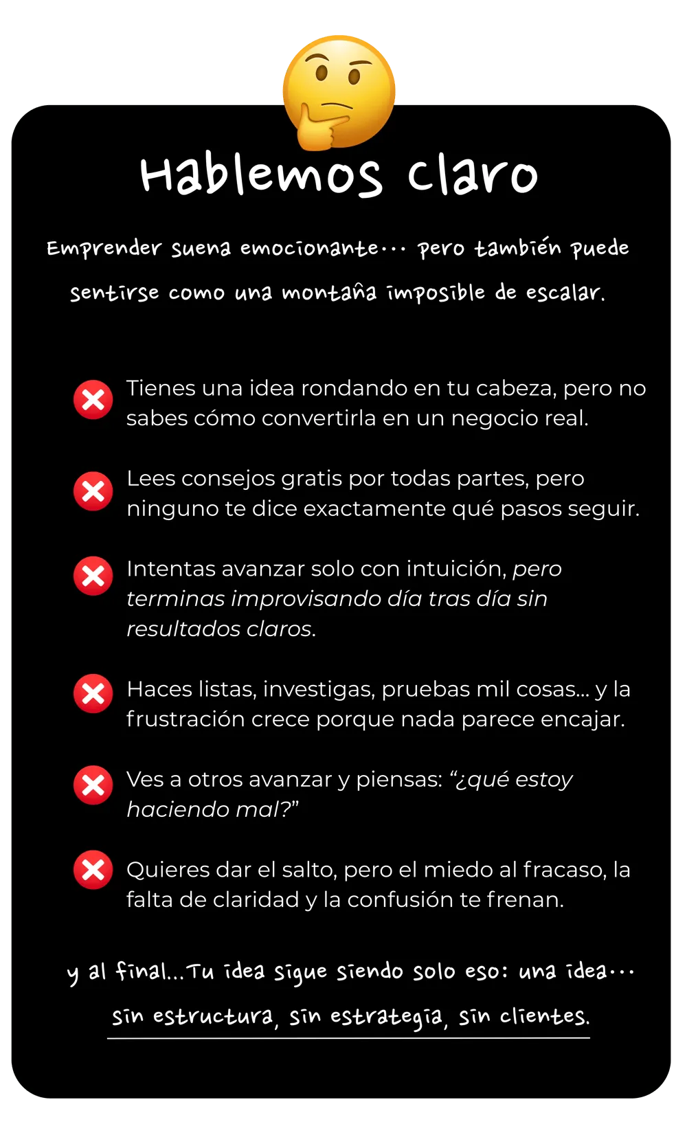 1. ¿Necesito tener una idea de negocio clara antes de entrar al curso? No. El curso está diseñado tanto para quienes ya tienen una idea y quieren validarla como para quienes solo sienten las ganas de emprender, pero no saben por dónde empezar. Te acompaño paso a paso para que definas, estructures y lances tu proyecto.